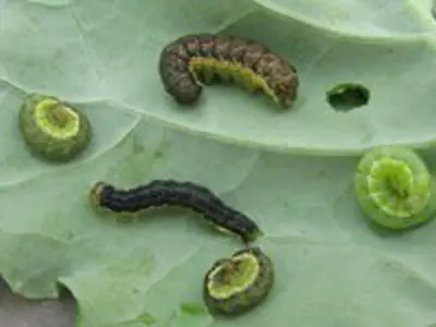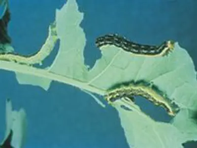 The larvae are responsible for the damage to canola by defoliating plants as well as eating seed pods. High numbers of larvae can cause complete destruction of a crop in a very short time period. These larvae go through six growth stages from hatching to maturity and cause more damage with each stage
