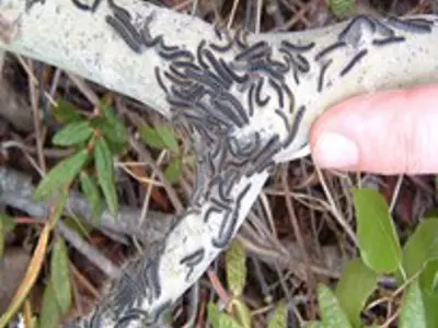 Yes, those large black clumps of wriggling things you see in the crooks of yours trees, or clustered on the trunk or branches, are Forest Tent Caterpillars. They grow around 5 centimetres long and have a striking blue strip and what appears to be brown fur.