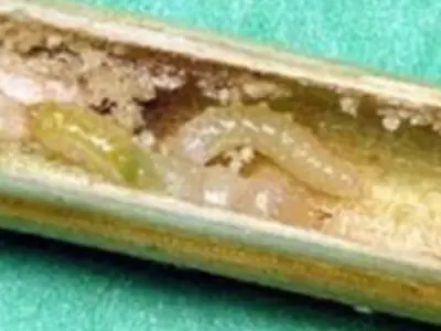 Feeding of the stem by larvae reduces yield and quality of grain. Mature larvae chew around or inside the stem during the late summer. Damage is often diagnosed by the presence of sawdust-like frass inside the stem of the wheat.