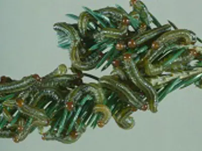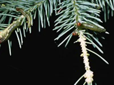 This pest attacks the needles of spruce trees. Young and open-grown trees are especially vulnerable. Larvae will feed on new needles and work their way to older ones. Eventually, the stripping of needles will weaken the tree, and can kill the tree if attacked for 2 or 3 years in a row.