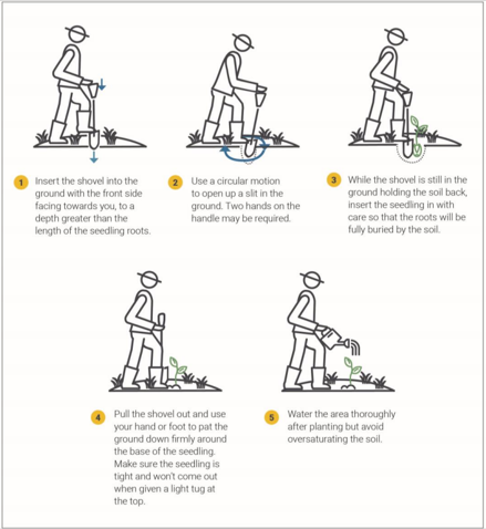 If you are planting a large number of seedlings, consider using a tree planting shovel rather than a generic spade. A tree planting shovel is specially designed to make a slit in the ground that will help you plant seedlings more efficiently.