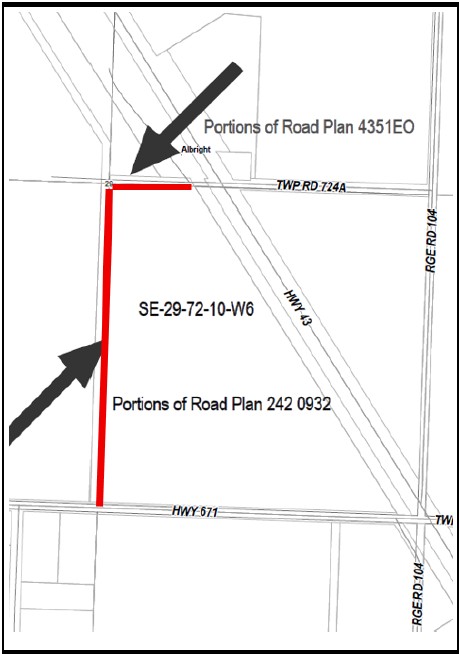 road plans to allow for their consolidation into proposed adjacent parcel(s). This consolidation would result in the County disposing of its interest in these portions of land. This consolidation will enable the County to secure a new road alignment through Pt. SE-29-72-10-W6 that would divert traffic to an upgraded intersection at HWY 671 & HWY 43 which will improve traffic flow and safety in the area.
